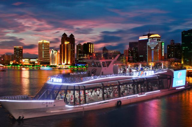 广发证券号外形设计灵感来自于荷兰阿姆斯特丹游船的风格,简洁、流畅的线条成为珠江上一道亮丽的风景。一楼为通透的落地玻璃空调观光大厅,二楼船头还有40平方米左右的露天平台,让您体验翱翔于天水之间的乐趣。